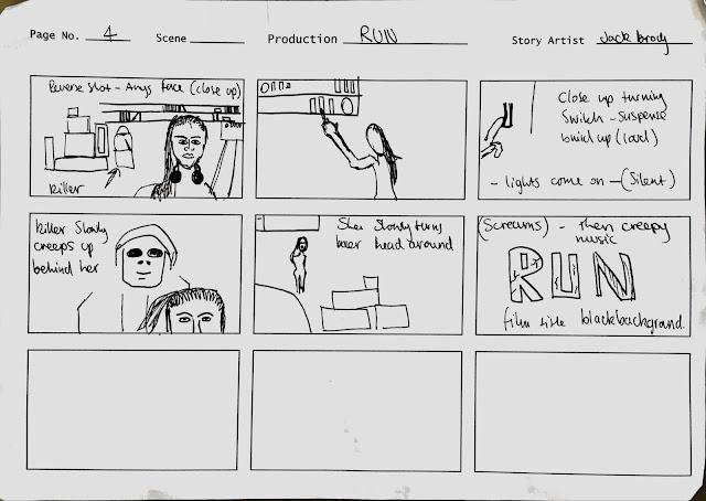 Creating these story boards have helped me with my organization and has put each shot down on paper rather then in my head, these story boards will be used by me and the actors in the movie so we are all organized and so that we know exactly what we are doing, this acts like a visual screenplay. Each frame contains rough sketches and notes, as you can see I haven't put too much detail in but I have made it clear to understand.